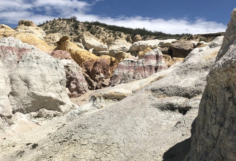Auf drei Quadratkilometern erstrecken sich die bunten Schichten, bizarren Strukturen und Nadeln, sogenannte Hoodoos, aus Lehm, der sich in Gelb, Rosa, Weiß und Malvenfarben zeigt. Menschliche Spuren reichen 9.000 Jahre zurück, so nutzten die amerikanischen Ureinwohner damals schon den bunten Lehm zur Farbenherstellung, woher auch der Name Paint Mines rührt. Die Farben, die hier in unterschiedlichen Schichten im Lehm freigelegt sind, entstehen durch oxidiertes Eisen.